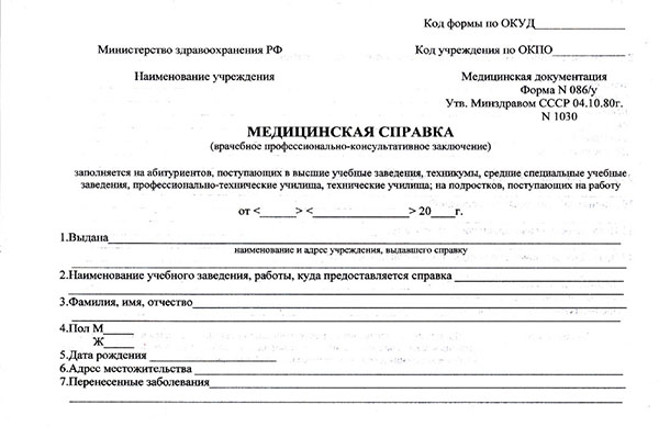 Для поступления в любое учебное заведение абитуриент должен предоставить в приёмную комиссию целый пакет документов, в том числе и медицинскую справку по форме 086/у.